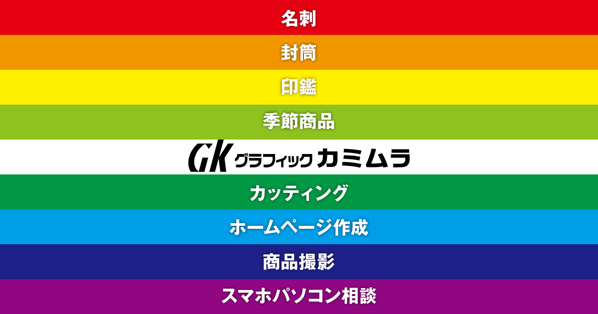 | 事業内容 | ・名刺、封筒などのデザイン印刷 ・季節商品印刷 ・印鑑作成 ・カッティングシート作成 ・ホームページ作成 ・撮影代行 |